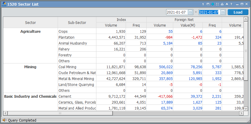 Displays the details of buying and selling transactions for sectors and sub-sectors based on a certain time period.