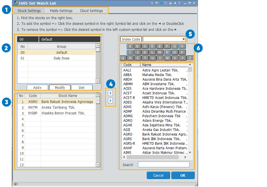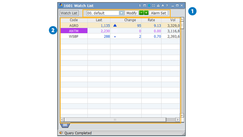 Contains the watchlist groups that you have saved. Here are the functions of the buttons:
