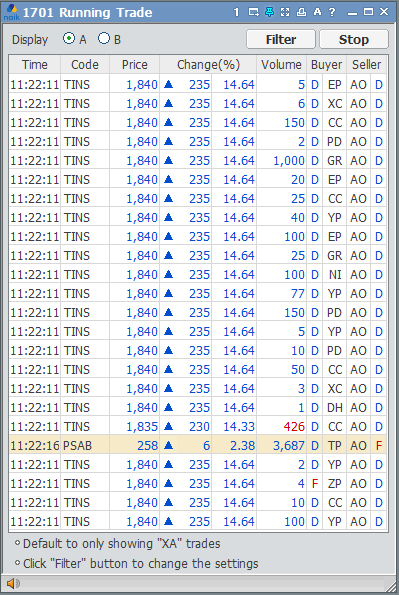 The following details contain the share price and transaction volume according to exchange hours, along with the brokers of various securities.
