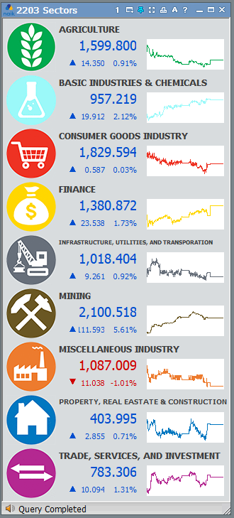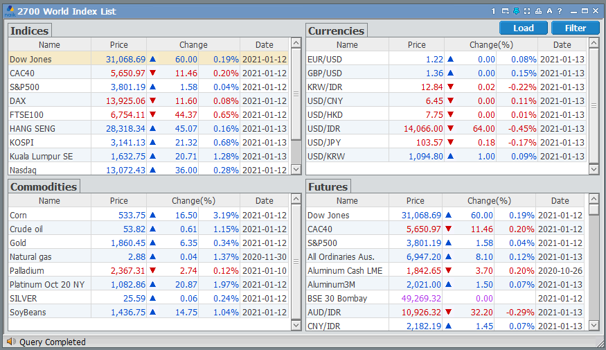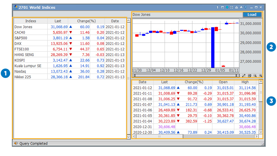 Displays the index along with the latest data on average stock prices, increase / decrease values and graphs.