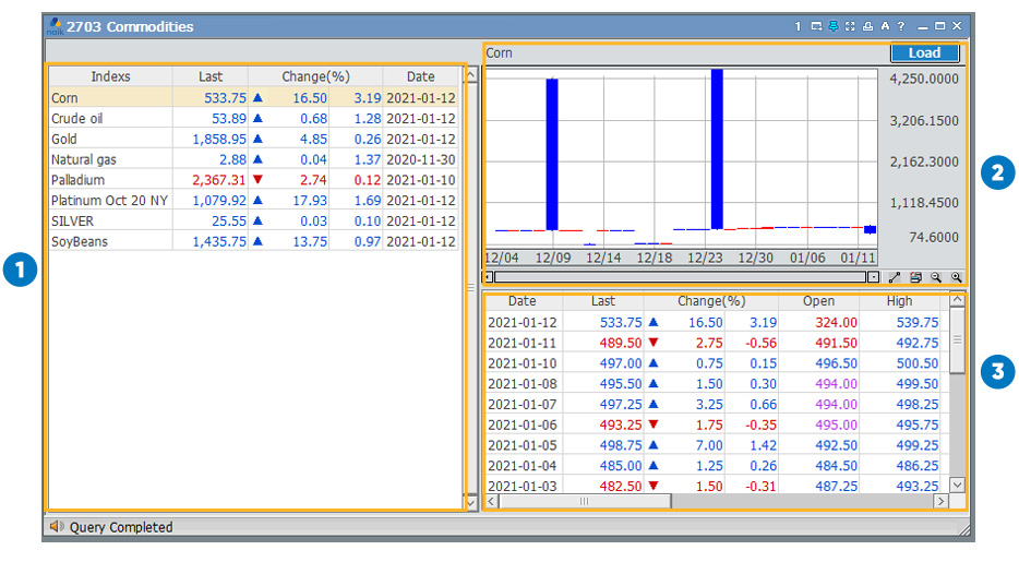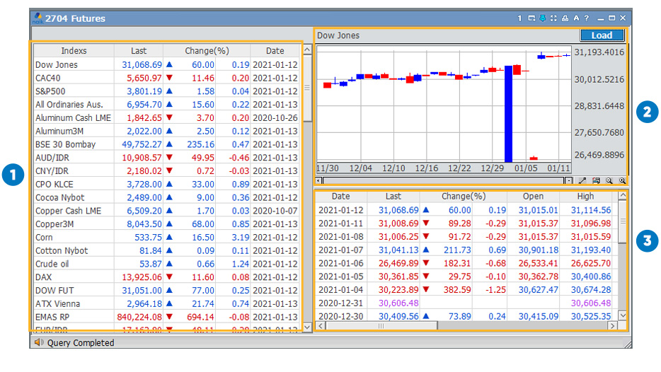 This screen displays information in the form of foreign indices, currency, commodities, and futures.