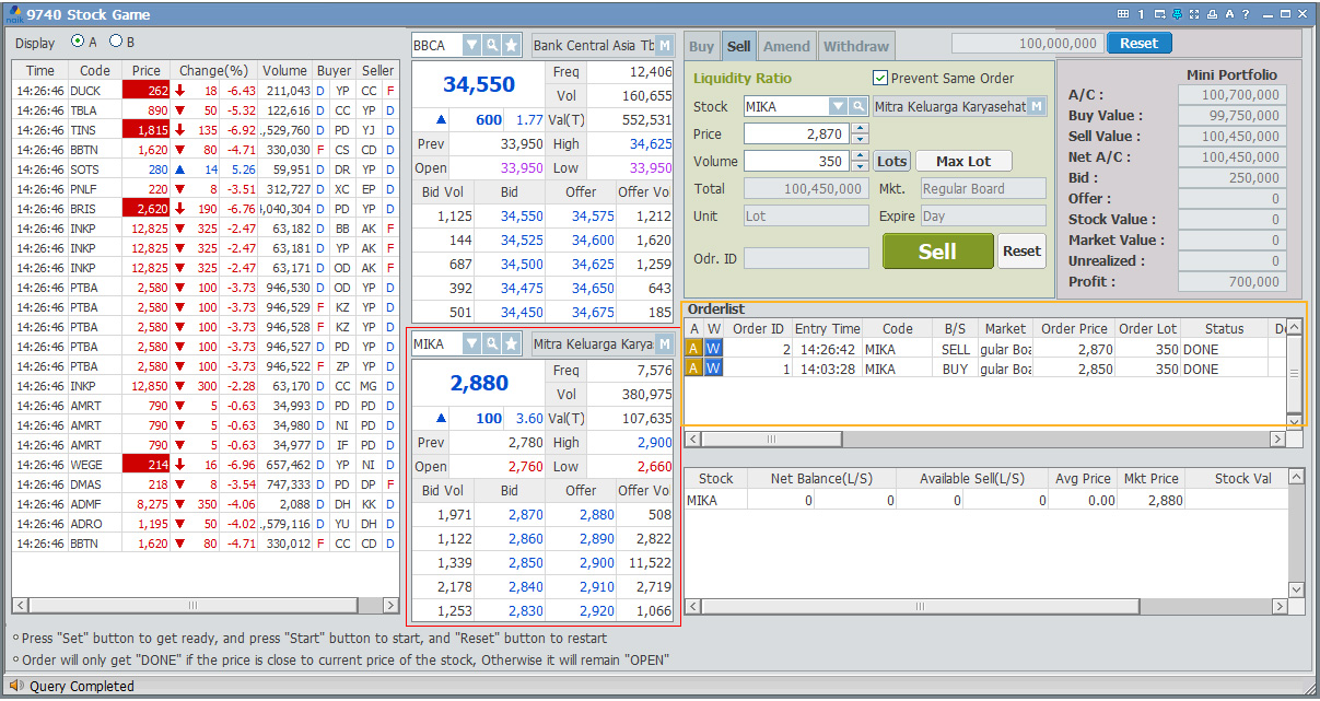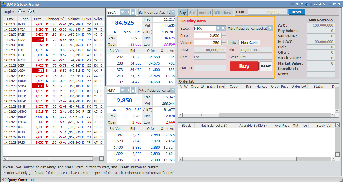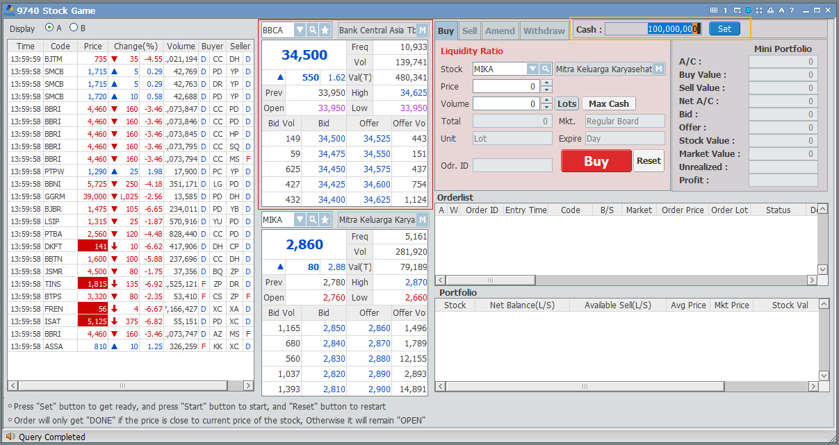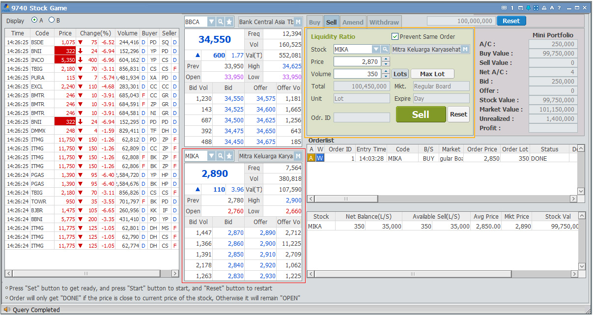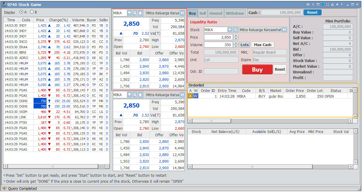 Select the stock you want, then you can press the Buy button to buy the stock and Sell to sell the stock. This section displays a brief breakdown of the bid / offer prices along with the transaction volume.