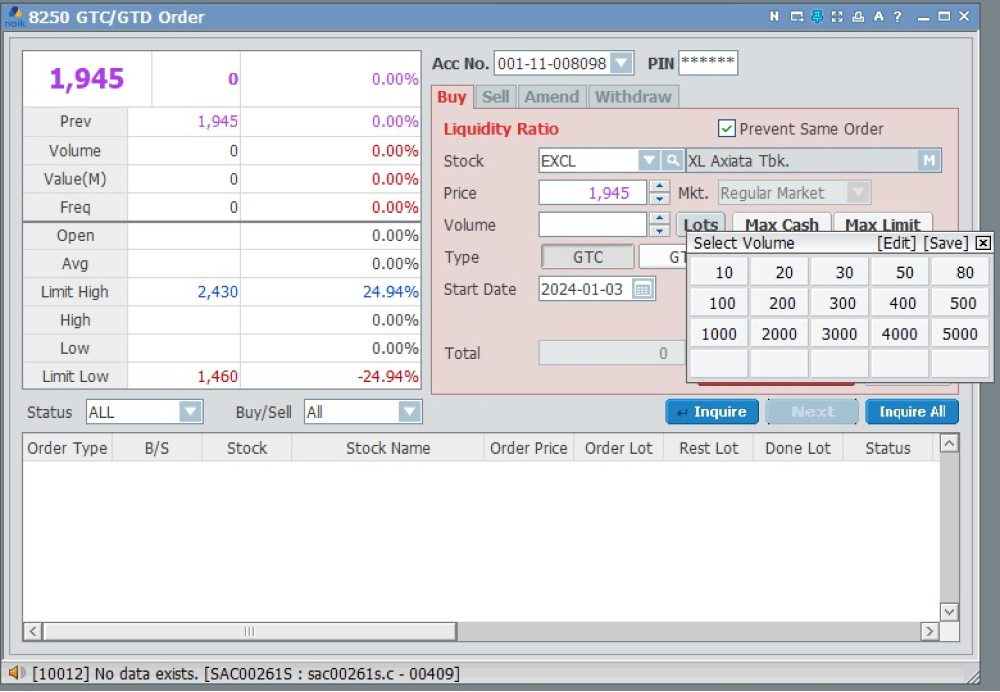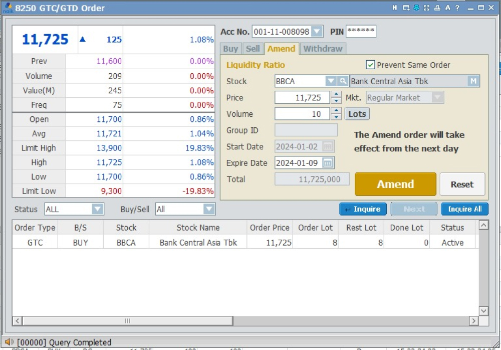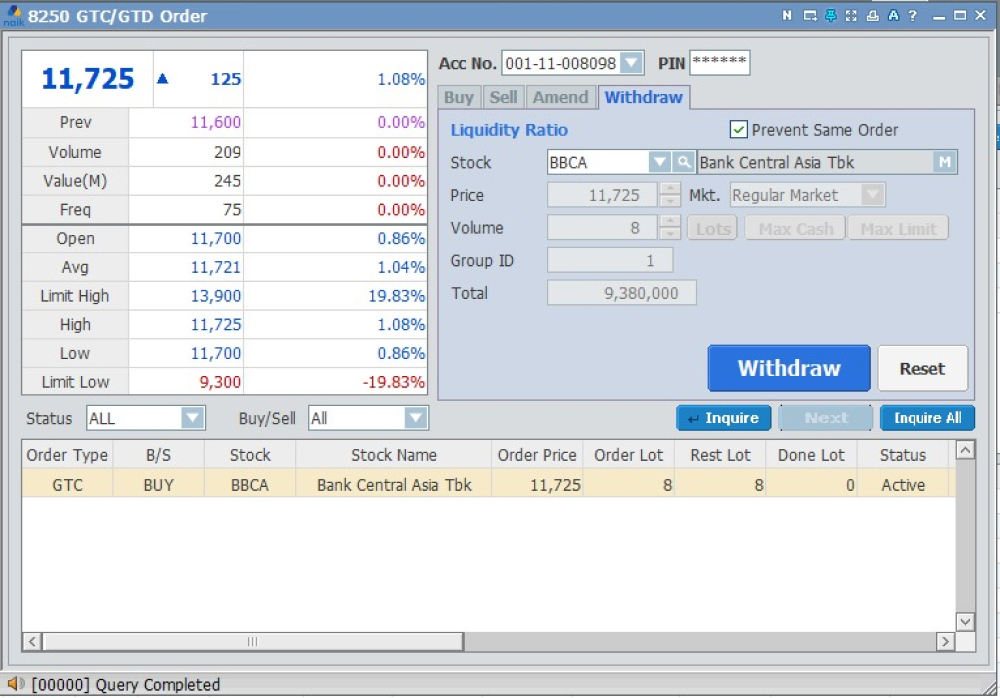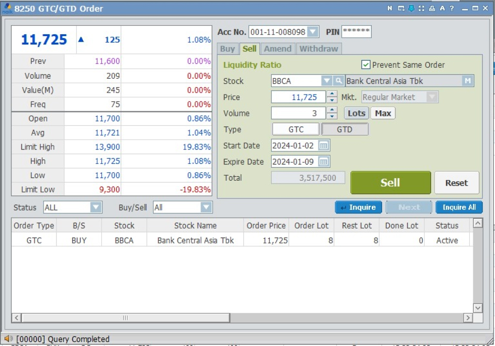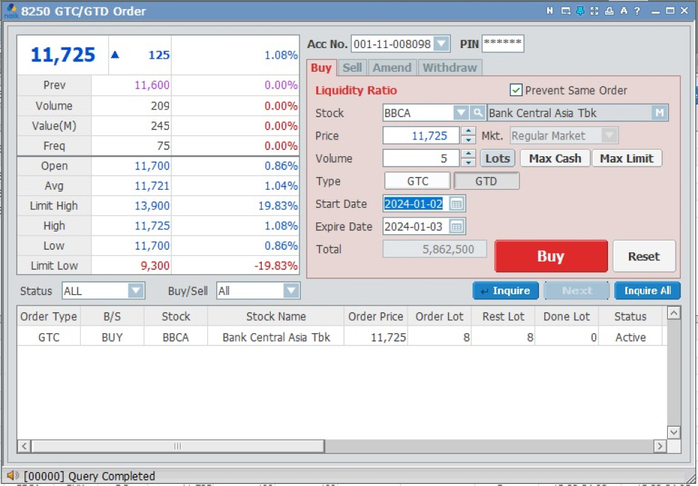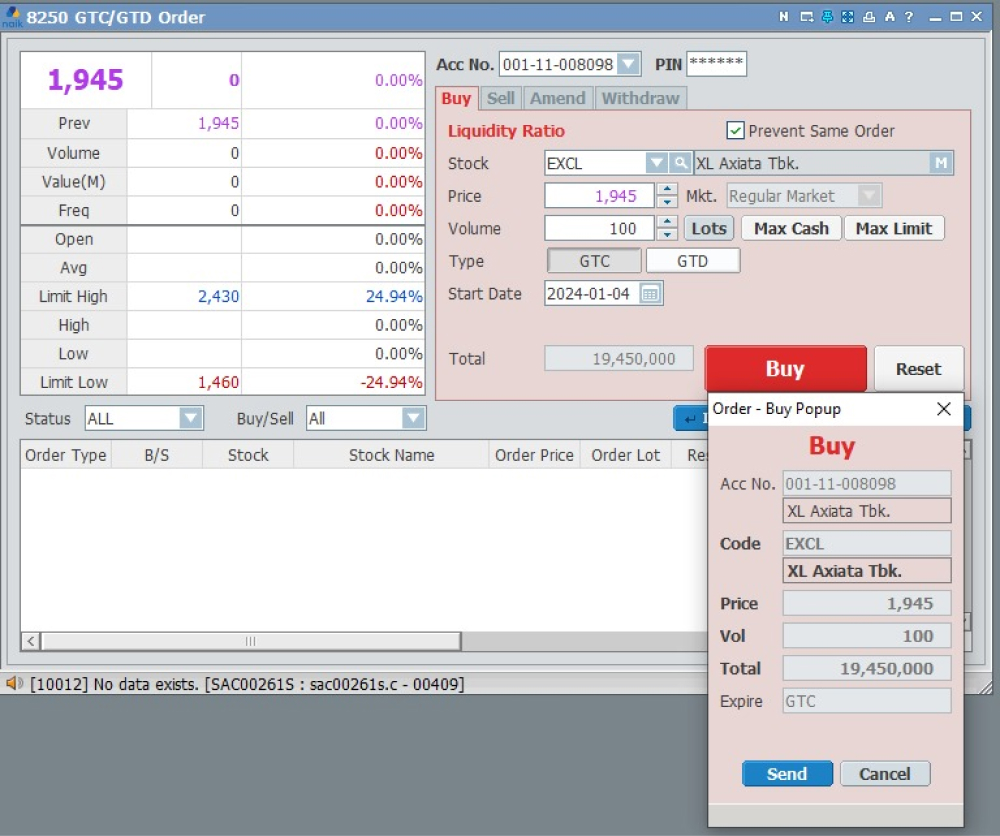 - The GTC/GTD order should be conduct on (1) market hour or (2) between after market hour and before closed process. Because if the order input after the closing process, the GTC/GTD order is processed the day after tomorrow.